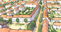 Each neighborhood has its own small village square/center, as well as neighborhood parks and playgrounds. The new train station is located at the southeast corner of Neighborhood 1, at the junction with a new proposed access road. The station is relatively central to the development as a whole, allowing residents from all three neighborhoods easy access by foot or bicycle. The street system is conceived primarily for the pedestrian; a rigid grid is avoided. Instead, the streets meander in the direction of the pedestrian flow between the station and the residential areas. Resulting is a high street which connects the station in the south with all the main squares in Neighborhoods 1 and 3. Two streets to the north and south edge of the forest, as well pedestrian paths leading through the woods connect Neighborhood 2 with the rest of the town.
