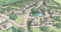 Das neue Konzept sieht die Errichtung von vier kleineren ‚Dörfern’ vor, jedes mit einer Mischung von Haustypen und -größen. Die Dörfer sind durch kleinere Straßen und Fußwege miteinander verbunden, die zu einem kleinen Marktplatz im größesten Dorf führen.